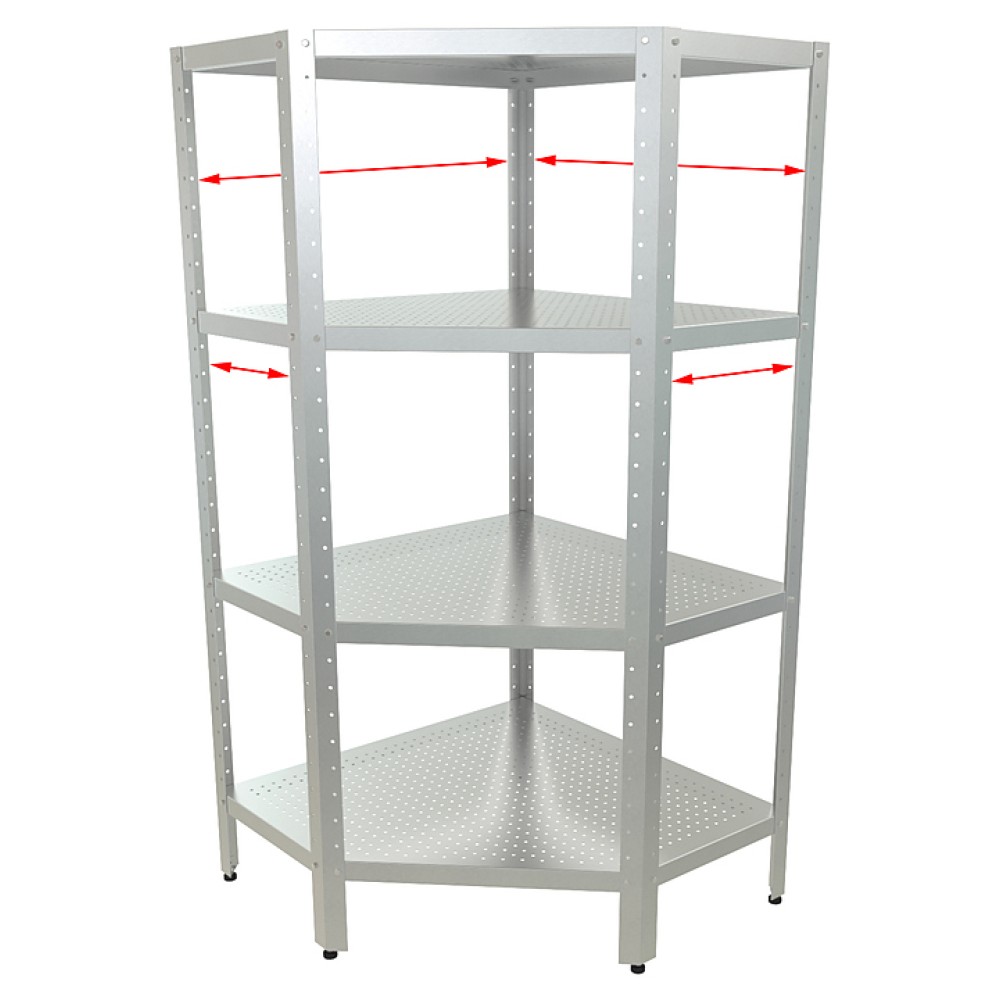 Угловой кухонный стеллаж Кобор СКПУ-4/6-100/80 предназначен для хранения посуды, различного инвентаря и сухих продуктов на предприятиях общественного питания и торговли. Модель оснащена перфорированными полками. Разборный каркас выполнен из уголка из оцинкованной стали, полки - из нержавеющей стали AISI 430.