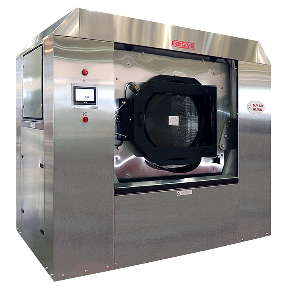 Машина для стирки и отжима ковров Вязьма ВО-100.22241.Б2 используется в прачечных, образовательных, оздоровительных заведениях, на производственных предприятиях, в поликлиниках, гостиницах, детских садах, общежитиях, больницах, роддомах и воинских частях для стирки, полоскания и отжима грязезащитных резиновых ворсовых ковров. Модель оснащена наклонным барабаном на пневмоподушках и дверцей люка с пневмоуправляемым замком.