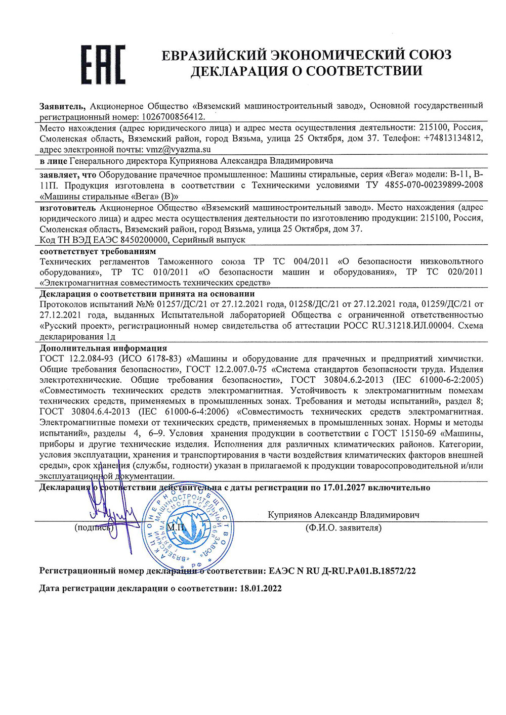 Стиральная машина Вязьма В-11 серии "Вега" используется в прачечных образовательных, оздоровительных заведениях, производственных предприятиях, в поликлиниках, гостиницах, детских садах, общежитиях, больницах, роддомах и воинских частях для стирки, полоскания и отжима белья, ткани и одежды. Модель имеет 8 выходов для подключения дозирующих насосов для жидких моющих средств. Насосы работают напрямую от контроллера машины и не требуют приобретения дополнительного блока управления к ним. Подключив к машине насосы для жидких моющих средств и подобрав правильную химию, можно использовать машину как аквачистку – альтернативу дорогостоящей химчистке. Внутренний и наружный барабаны изготовлены из нержавеющей стали, облицовки - из окрашенной стали.
