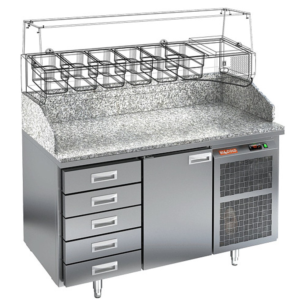 Стол для пиццы HICOLD PZ4-1/GN используется на предприятиях общественного питания и торговли для раскатки теста и обработки ингредиентов, используемых для приготовления пиццы, салатов и других блюд, а также для охлаждения и кратковременного хранения скоропортящихся продуктов и напитков. Модель совмещает в себе рабочую поверхность и охлаждаемый объем, оснащена нейтральным модулем на 5 выдвижных ящиков с контейнерами для теста. Корпус выполнен из нержавеющей стали, столешница - из гранита.