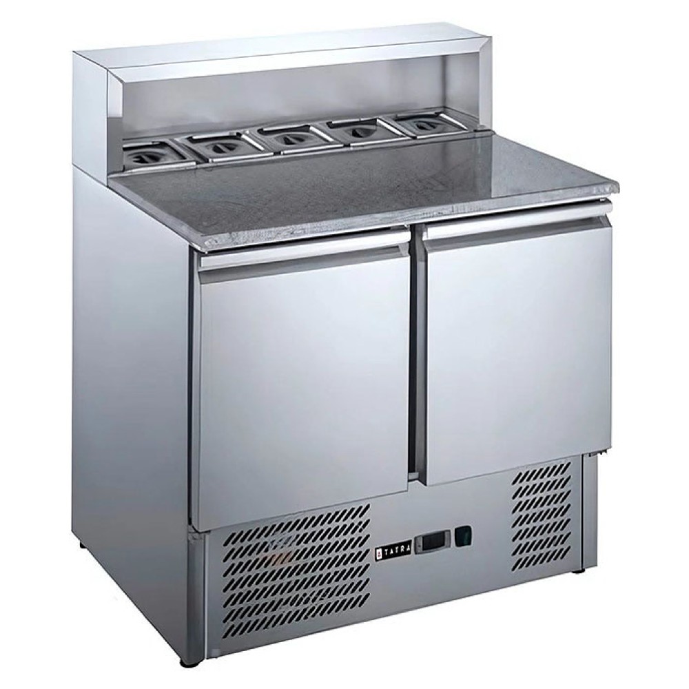 Стол Tatra TPZGNL2 V ST предназначен для приготовления пиццы на предприятиях общественного питания и торговли. Модель оснащена встроенным холодильным агрегатом с нижним расположением, цифровым термостатом, 2 глухими дверьми с магнитным уплотнителем, отделением для гастроемкостей с крышкой и регулирумыми по высоте ножками. Корпус выполнен из высококачественной нержавеющей стали, столешница - из камня, крышка - из металла.