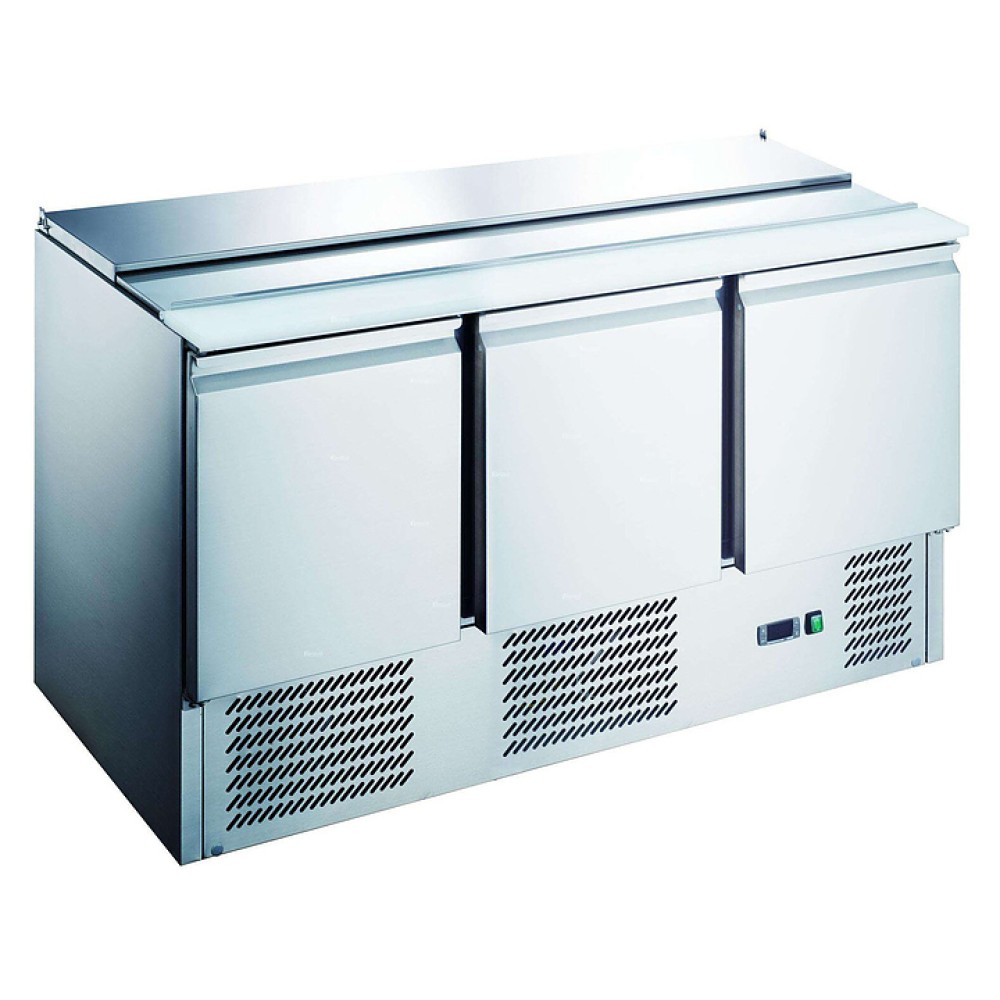 Холодильный стол для салатов Hurakan HKN-SL3 предназначен для обработки ингредиентов, используемых для приготовления салатов, охлаждения и кратковременного хранения скоропортящихся продуктов и напитков на предприятиях общественного питания и торговли. Модель оснащена тремя дверьми, отсеками для гастроемкостей и 2 плоскими верхними панелями. Столешница изготовлена из нержавеющей стали.