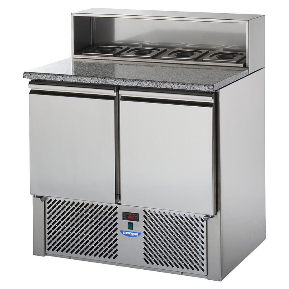 Стол для салатов Tecnodom SLV02AI используется на предприятиях общественного питания и торговли для обработки ингредиентов, используемых для приготовления пиццы, салатов и других блюд, а также для охлаждения и кратковременного хранения скоропортящихся продуктов и напитков. Модель оснащена электронной панелью управления с NTC датчиком и надстройкой над столешницей, вмещающей гастроемкости. Корпус, за исключением агрегатного отсека, и надстройка выполнены из нержавеющей стали, столешница - из гранита, теплоизоляция - полиуретан, впрыскиваемый под высоким давлением.