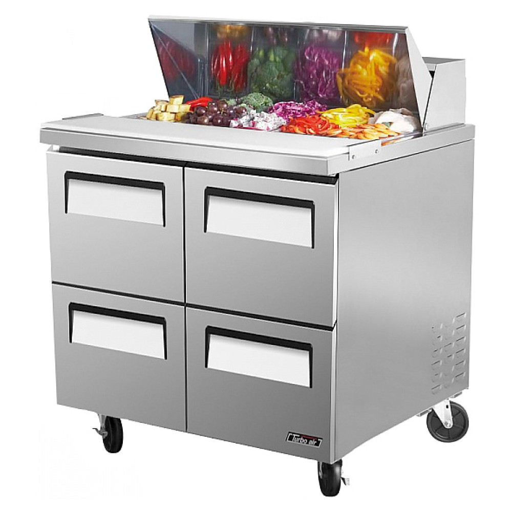 Стол для сбора сэндвичей Turbo air CMST-36-2D-4 предназначен для кратковременного хранения и нарезки ингредиентов для бургеров и для сборки готовых продуктов на предприятиях общественного питания и торговли. Модель оснащена 4 ящиками с эргономичными ручками и 4 колесами. Корпус выполнен из нержавеющей стали (гальванизированная сталь на оборотной стороне и внизу), уплотнения - из ABS-пластика, пол - из нержавеющей стали с алюминиевыми вставками по бокам и сзади оборудования, тройные направляющие ящиков - из высококачественной нержавеющей стали, разделочная доска - из пищевого полиэтилена низкой плотности высокого давления.