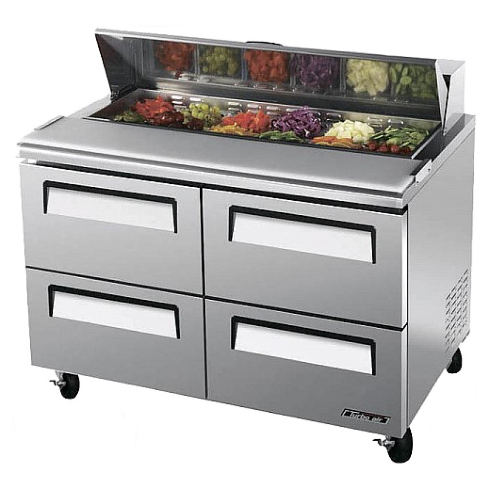 Холодильный стол Turbo air CMST-48-2D-4 используется на предприятиях общественного питания и торговли для обработки ингредиентов, используемых для приготовления сэндвичей, охлаждения и кратковременного хранения продуктов. Модель оснащена эргономичными ручками и 4 колесами. Корпус и направляющие выполнены из нержавеющей стали, пол - из нержавеющей стали с алюминевыми вставками по бокам и сзади, разделочная доска - из пищевого полиэтилена LDPE, уплотнение - из ABS пластика.