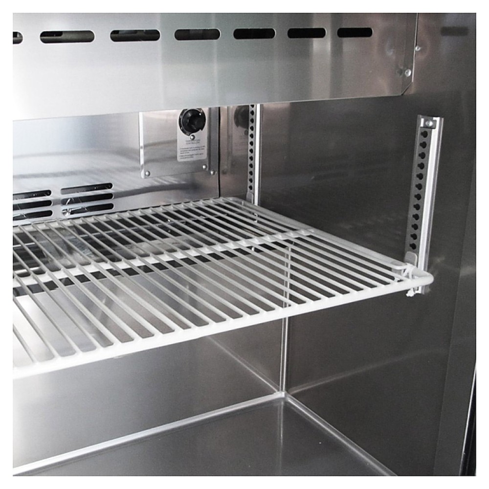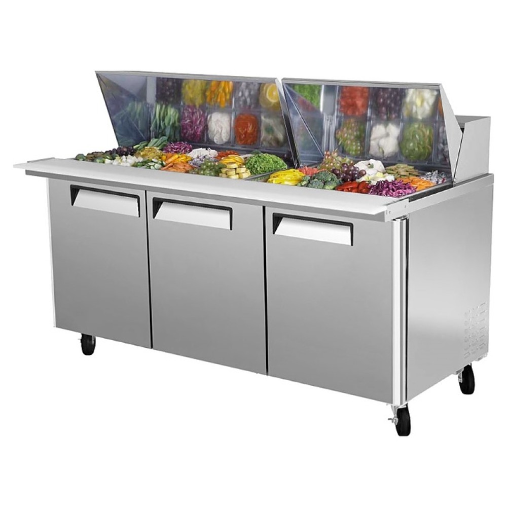 Стол для сбора сэндвичей Turbo air CMST-72-30 предназначен для кратковременного хранения и нарезки ингридиентов для бургеров и для сборки готовых продуктов на предприятиях общественного питания и торговли. Модель оснащена 3 полками и 4 фронтальными колесами со стопорами. Корпус выполнен из нержавеющей стали (гальванизированная сталь на оборотной стороне и внизу) с применением пожаробезопасных стенок толщиной 60 мм, уплотнения - из АБС-пластика, который улучшает теплоизоляцию и не пропускает конденсат, пол - из нержавеющей стали с алюминиевыми вставками по бокам и сзади оборудования, регулируемые полки - из толстой стальной проволоки с виниловым покрытием, двери собственной конструкции оснащены петлями из высококачественной нержавеющей стали.