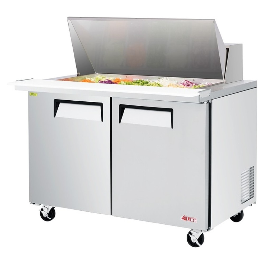 Холодильный стол Turbo air EST-48-18 серии E line используется на предприятиях общественного питания и торговли для кратковременного хранения предварительно охлажденных пищевых продуктов и приготовления из них сэндвичей. Модель оснащена встоенным холодильным агрегатом, холодильной камерой с распашными дверьми и столешницей с боковыми фиксаторами для разделочной доски. Вертикально ориентированный корпус за исключением задней стенки, фронтальная облицовка двери, столешница и крышка выполнены из высококачественной нержавеющей стали SUS439 производства Posco, полка – из стального прутка с виниловым покрытием, разделочная доска – из термостойкого полиэтилена, термоизоляция – из пенополиуретана высокой плотности, испаритель с антикоррозийным покрытием.