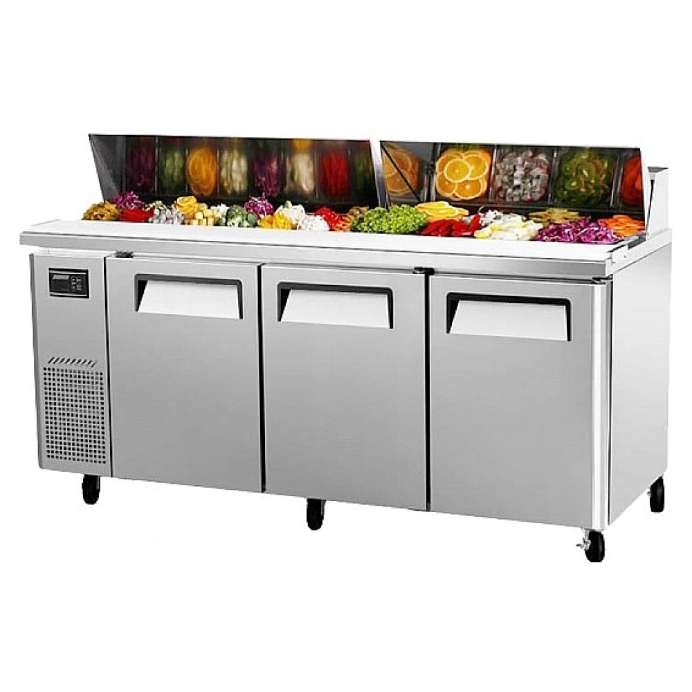 Холодильный стол Turbo air KHR18-3-750 используется на предприятиях общественного питания и торговли для обработки ингредиентов, используемых для приготовления сэндвичей, охлаждения и кратковременного хранения продуктов. Модель оснащена 3 дверцами с эргономичными ручками, 3 полками и 6 колесами. Корпус выполнен из нержавеющей стали (гальванизированная сталь на оборотной стороне и внизу), пол - из нержавеющей стали с алюминевыми вставками по бокам и сзади, дверные петли - из нержавеющей стали, полки - из толстой стальной проволоки с виниловым покрытием, разделочная доска - из пищевого полиэтилена LDPE, уплотнение - из ABS пластика.