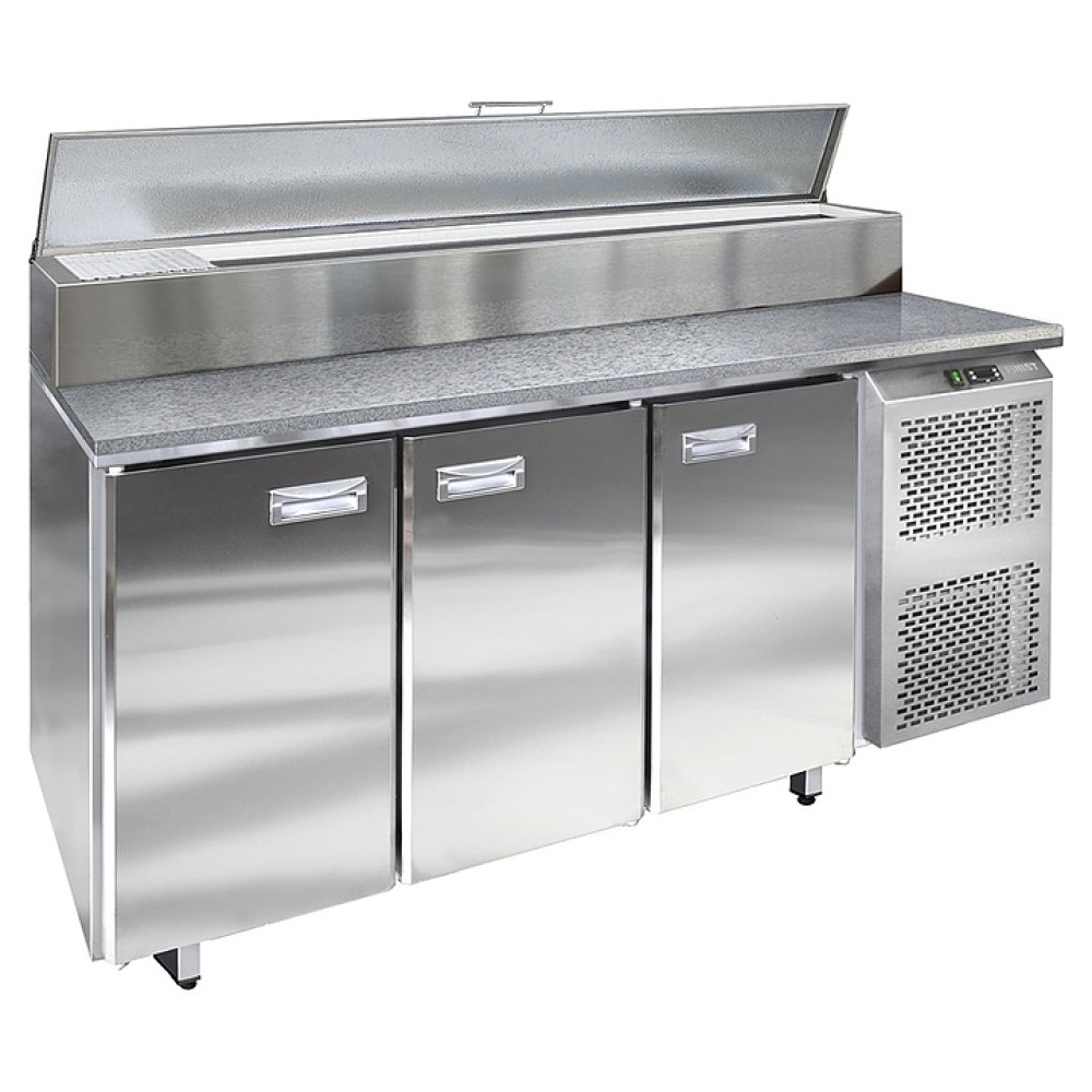 Холодильный стол Finist СХСпцг-700-3(1/3) предназначен для хранения скоропортящихся полуфабрикатов из мяса, рыбы и других ингридиентов для приготовления пиццы на предприятиях общественного питания и торговли. Модель оснащена встроенным холодильным агрегатом с боковым расположением, столешницей повышенной прочности, охлаждаемым салат-баром для гастроемкостей с крышкой, холодильной камерой с 3 секциями с распашными дверьми, устойчивыми опорами с подпятниками, кабелем питания с евровилкой и панелью управления. Корпус за исключением задней стенки выполнен из высококачественной нержавеющей стали, столешница – из гранита.