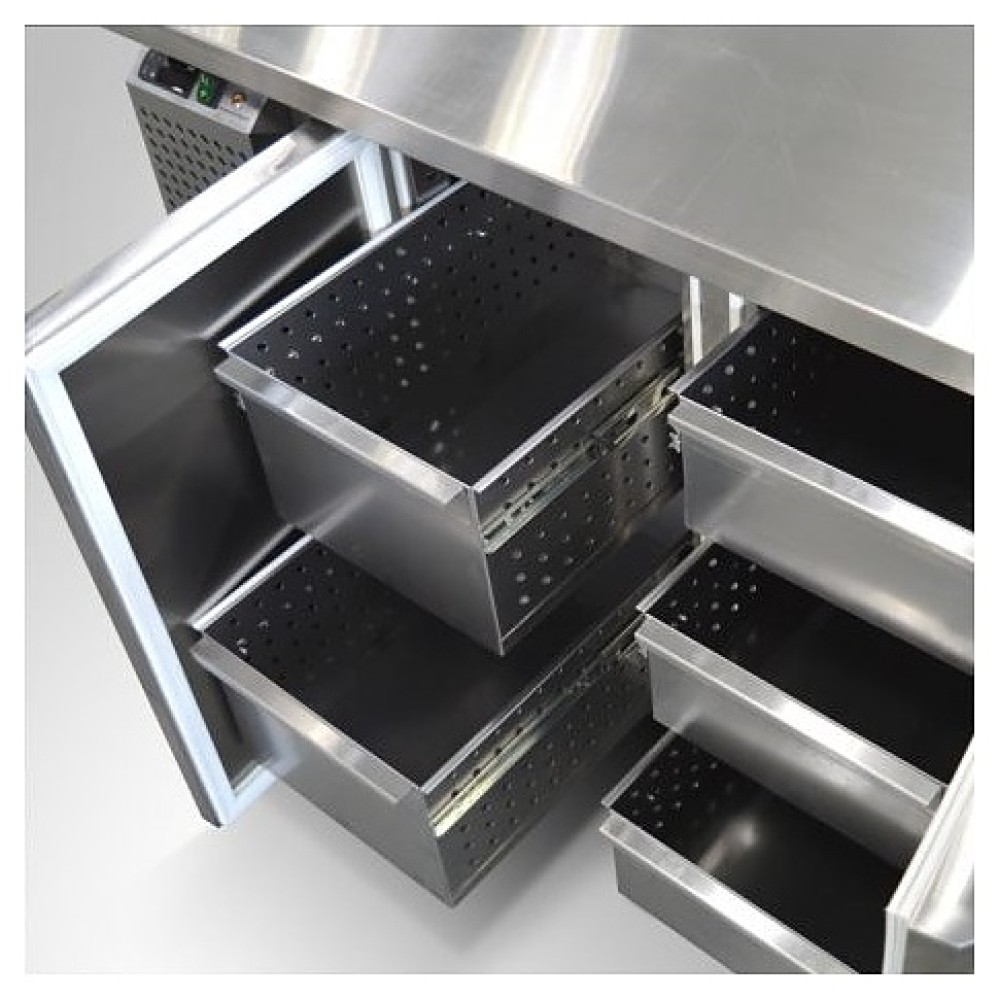Холодильный стол Finist СХСпцг-700-4 предназначен для хранения скоро портящихся полуфабрикатов из мяса, рыбы и других ингридиентов для приготовления пиццы на предприятиях общественного питания и торговли. Модель оснащена расположенным сбоку агрегатным отсеком, столешницей с отсеком для гастроемкостей с крышкой, 4 холодильными камерами с распашными дверцами, устойчивыми ножками с подпятниками, кабелем питания с евровилкой и кнопочной панелью управления с цифровым дисплеем. Корпус выполнен из высококачественной нержавеющей стали, столешница – из гранита.
