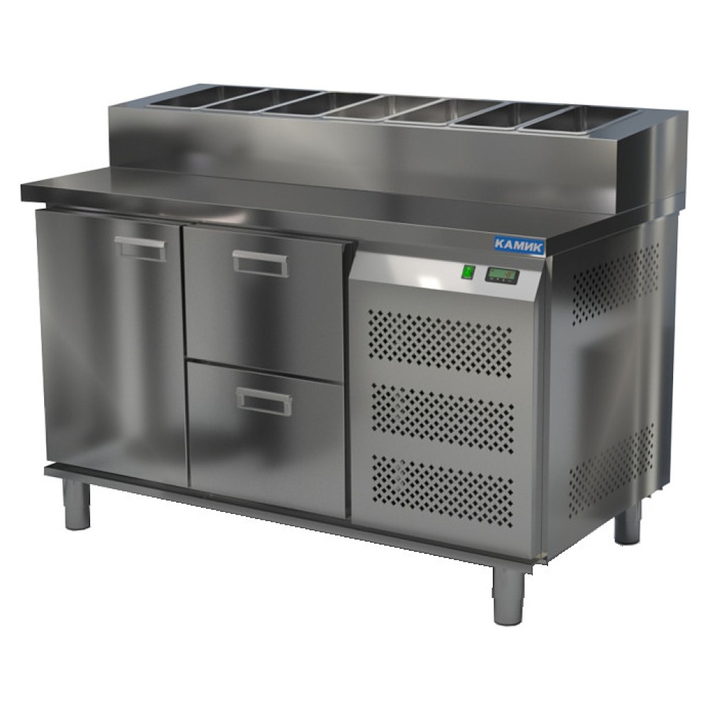 Холодильный стол КАМИК СОП-121473 используется на предприятиях общественного питания и торговли для охлаждения и хранения продуктов, напитков и готовых блюд, а также для раскатки теста и обработки ингредиентов для приготовления пиццы. Конструкция разделена на секции, каждая из которых оборудована сетчатой полкой и парой направляющих. Корпус выполнен из нержавеющей стали AISI 430 толщиной 1 мм, столешница - из нержавеющей стали AISI 304 толщиной 1 мм.