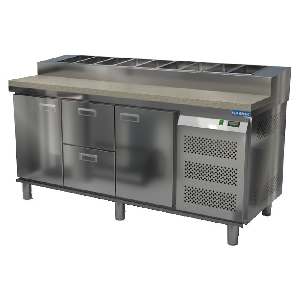 Холодильный стол КАМИК СОП-К-2218573 используется на предприятиях общественного питания и торговли для охлаждения и хранения продуктов, напитков и готовых блюд, а также для раскатки теста и обработки ингредиентов для приготовления пиццы. Конструкция разделена на секции, каждая секция с дверью оборудована сетчатой полкой и парой направляющих. Корпус выполнен из нержавеющей стали AISI 430 толщиной 1 мм, столешница - из камня.