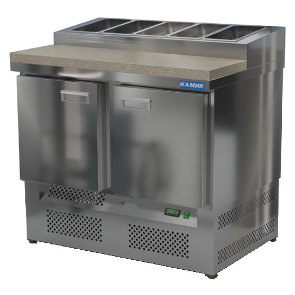 Холодильный стол КАМИК СОПН-К-201076 используется на предприятиях общественного питания и торговли для охлаждения и хранения продуктов, напитков и готовых блюд, а также для раскатки теста и обработки ингредиентов для приготовления пиццы. Конструкция разделена на секции, каждая секция с дверью оборудована сетчатой полкой и парой направляющих. Корпус выполнен из нержавеющей стали AISI 430 толщиной 1 мм, столешница - из камня.