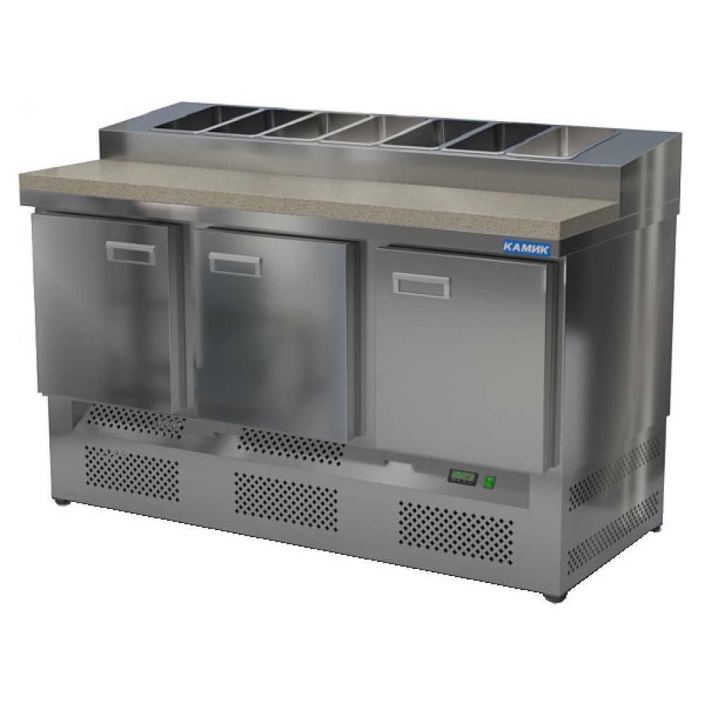 Холодильный стол КАМИК СОПН-К-301576 используется на предприятиях общественного питания и торговли для охлаждения и хранения продуктов, напитков и готовых блюд, а также для раскатки теста и обработки ингредиентов для приготовления пиццы. Конструкция разделена на секции, каждая из которых оборудована сетчатой полкой и парой направляющих. Корпус выполнен из нержавеющей стали AISI 430 толщиной 1 мм, столешница - из гранита.