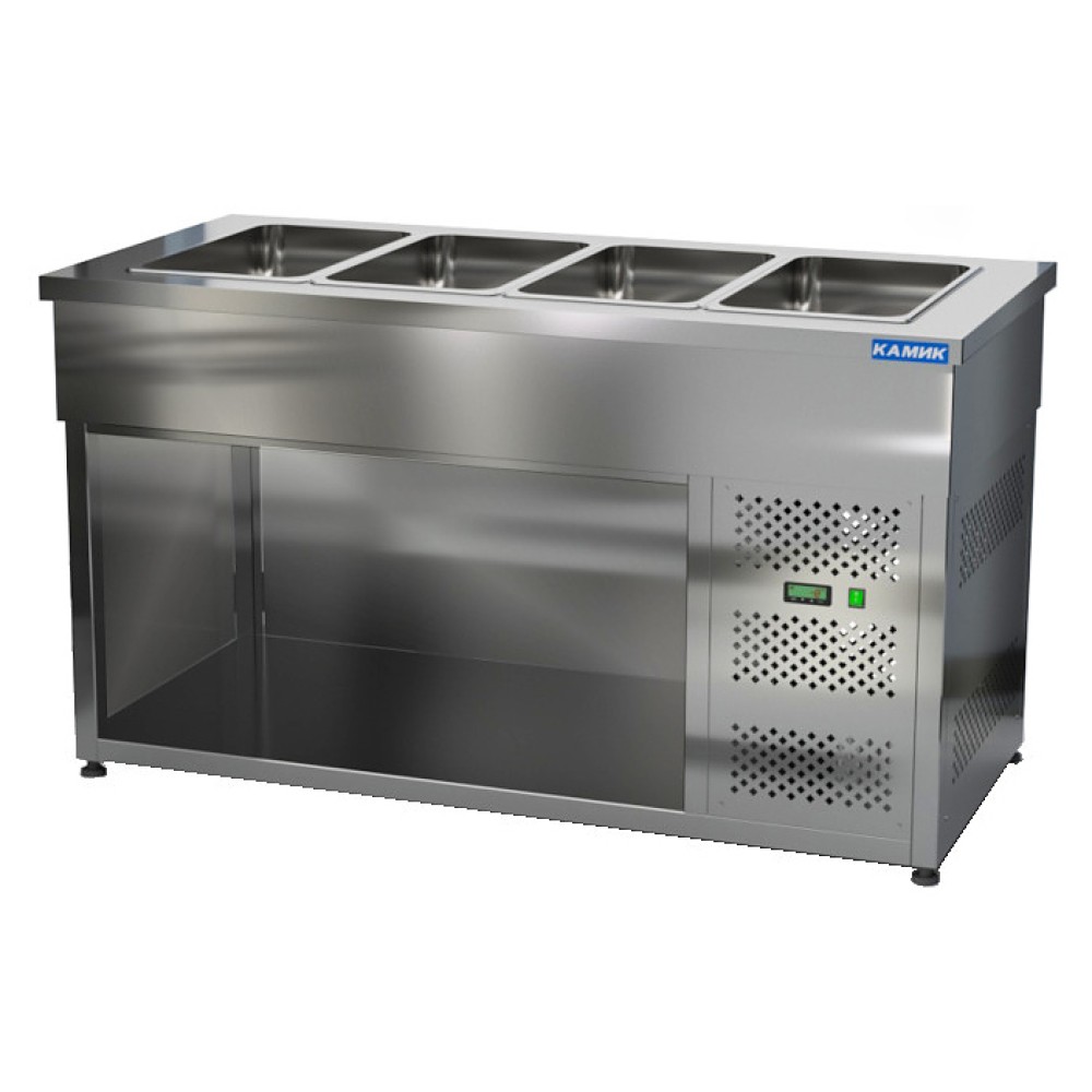 Холодильный стол КАМИК СОН-115000 используется на предприятиях общественного питания и торговли для охлаждения, демонстрации и кратковременного хранения ингредиентов для приготовления салатов, напитков и готовых блюд. Конструкция имеет модульное строение и разделена на секции, каждая секция с дверью оборудована сетчатой полкой и парой направляющих. Корпус выполнен из нержавеющей стали.
