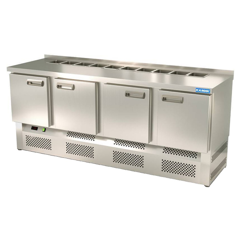 Холодильный стол КАМИК СОН-402073КН используется на предприятиях общественного питания и торговли для охлаждения, демонстрации и кратковременного хранения ингредиентов для приготовления салатов, напитков и готовых блюд. Конструкция разделена на секции, каждая секция с дверью оборудована сетчатой полкой и парой направляющих. Корпус выполнен из нержавеющей стали AISI 430 толщиной 1 мм, столешница - из нержавеющей стали AISI 304 толщиной 1,5 мм.
