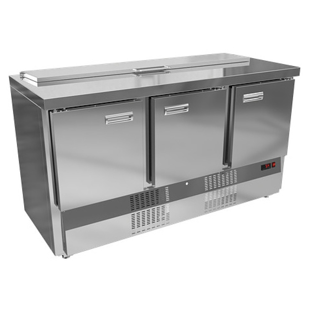 Холодильный стол KRONER СХС 3-150-70 предназначен для обработки и сохранения свежести ингредиентов для холодных закусок и салатов на предприятиях общественного питания и торговли. Модель оснащена встроенным компрессорным холодильным агрегатом с нижним расположением, столешницей, интегрированным в столешницу салат-баром, электронной панелью управления и холодильной камерой с 3 секциями с распашными дверьми. Цельнозаливные корпус, столешница и двери выполнены из шлифованной нержавеющей стали.