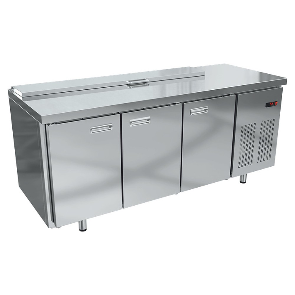 Холодильный стол KRONER СХСб 3-180-70 предназначен для обработки и сохранения свежести ингредиентов для холодных закусок и салатов на предприятиях общественного питания и торговли. Модель оснащена встроенным компрессорным холодильным агрегатом с боковым расположением, столешницей с задним бортом, интегрированным в столешницу салат-баром с откидной крышкой для размещения гастроемкостей, электронной панелью управления и холодильной камерой с 3 секциями с распашными дверьми. Корпус и столешница выполнены из шлифованной нержавеющей стали, задняя стенка – из оцинкованной стали.