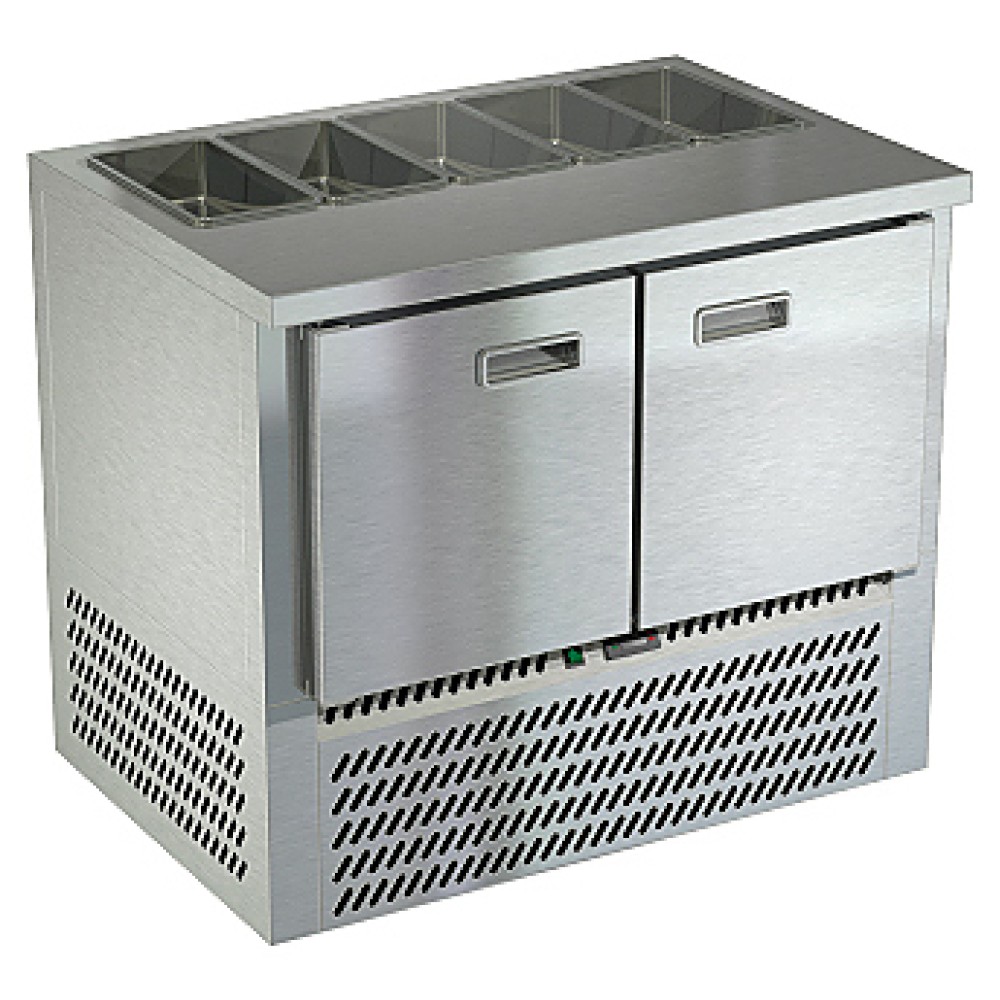 Холодильный стол Техно-ТТ СПН/С-124/20-1007 предназначен для обработки ингредиентов, используемых для приготовления салатов, охлаждения и кратковременного хранения продуктов на предприятиях общественного питания и торговли. Каждая секция оснащена направляющими и сетчатой полкой, двери - доводчиками. Корпус выполнен из нержавеющей стали, задняя стенка - из оцинкованной стали.