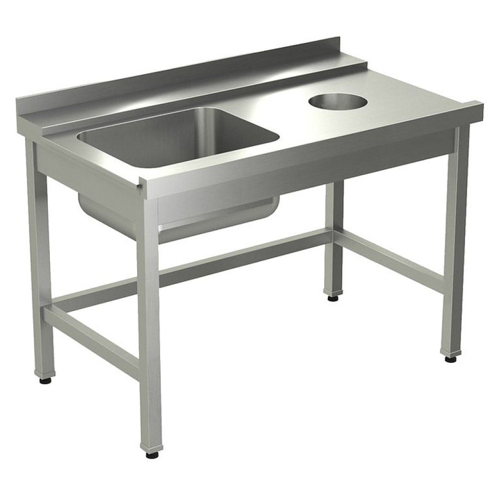 Стол KAYMAN СПМ-323/1207 используется на предприятиях общественного питания и торговли совместно с посудомоечными машинами TATRA TW.H50+DR и TW.H50+DR+DD для расстановки, временного хранения, предварительного ополаскивания и мытья грязной посуды и кухонного инвентаря. Модель оснащена разборным каркасом из трубы, раковиной, отверстием для сбора отходов, направляющими, плоским бортом и обвязкой с 3 сторон. Стол устанавливается справа от оборудования и имеет крепление на левой части. Столешница выполнена из нержавеющей стали AISI 304, каркас - из нержавеющей стали AISI 430.