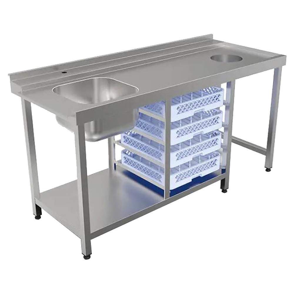 Входной стол для посудомоечной машины Кобор СПМ/1-170/70/Л используется на предприятиях общественного питания и торговли. Модель оснащена бортом, отверстием под смеситель, полкой в нижней части, отверстием для сбора отходов и 4 уровнями направляющих для посудомоечных кассет. Сварной каркас выполнен из нержавеющей трубы, столешница - из нержавеющей стали AISI 430, усиление - из ЛДСП.