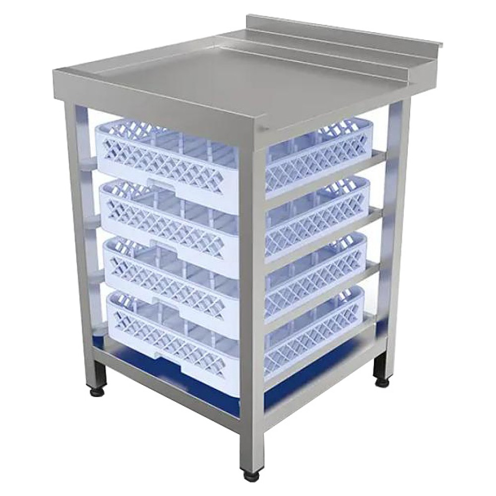 Выходной стол для посудомоечной машины Кобор СПМ/3-60/70/Л используется на предприятиях общественного питания и торговли. Модель оснащена бортом, полкой в нижней части и 4 уровнями направляющих для посудомоечных кассет. Сварной каркас выполнен из нержавеющей трубы, столешница - из нержавеющей стали AISI 430, усиление - из ЛДСП.