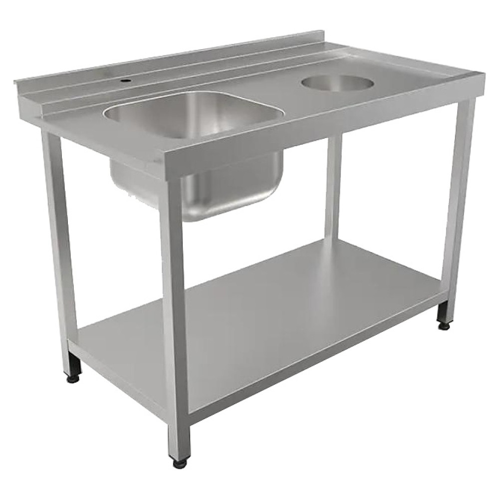 Входной стол для посудомоечной машины Кобор СПМ/4-120/70/Л используется на предприятиях общественного питания и торговли. Модель оснащена бортом, отверстием под смеситель, полкой в нижней части и отверстием для сбора отходов. Сварной каркас выполнен из нержавеющей трубы, столешница - из нержавеющей стали AISI 430, усиление - из ЛДСП.