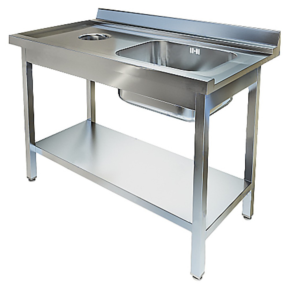 Приставной к посудомоечной машине стол Техно-ТТ СПО-523/1207Л/ПравКр используется на предприятиях общественного питания и торговли для мытья и ополаскивания посуды и различного инвентаря. Модель оснащена отверстием для сбора отходов, расположенным слева, моечной ванной справа, сплошной полкой и регулируемыми по высоте ножками, что позволяет компенсировать неровности пола. Разборный каркас выполнен из трубы 40х40 нержавеющей стали AISI 304, цельнотянутая мойка, полка и столешница - из нержавеющей стали AISI 304.