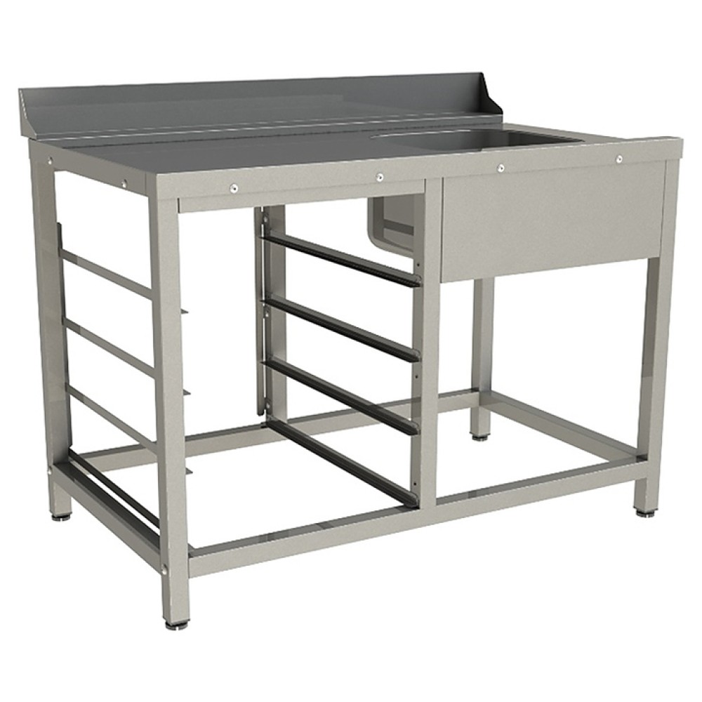 Входной стол Restoinox СВПМВЦН/1-12/7,4-Б предназначен для совместного использования с посудомоечной машиной для размещения и мойки грязной посуды на предприятиях общественного питания. Модель оснащена направляющими для кассет, цельнотянутой ванной, отверстием под смеситель и регулируемыми по высоте пластиковыми опорами. Каркас выполнен из трубы 40х40 мм нержавеющей стали AISI 430, столешница - из нержавеющей стали AISI 430, ванна - из нержавеющей стали AISI 304. Столешница усилена листом ЛДСП.