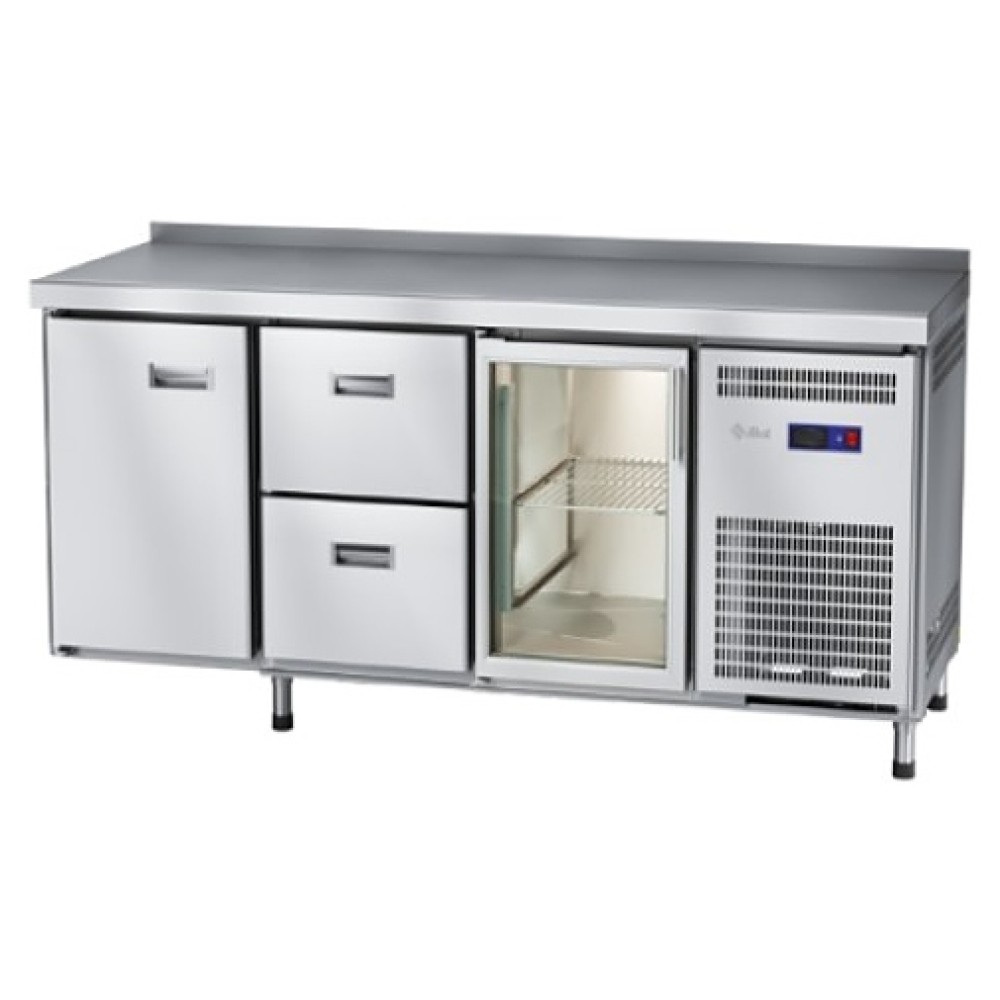 Холодильный стол Abat СХС-70-02 предназначен для раскатки теста, обработки ингредиентов для приготовления блюд, охлаждения и кратковременного хранения скоропортящихся продуктов и напитков на предприятиях общественного питания и торговли. Модель оснащена оснащена неохлаждаемой рабочей поверхностью, распашной стеклянной дверцей с уплотнителями с магнитной вставкой слева, 2 ящиками посередине, распашной дверцей с уплотнителями с магнитной вставкой справа и регулируемыми по высоте ножками.