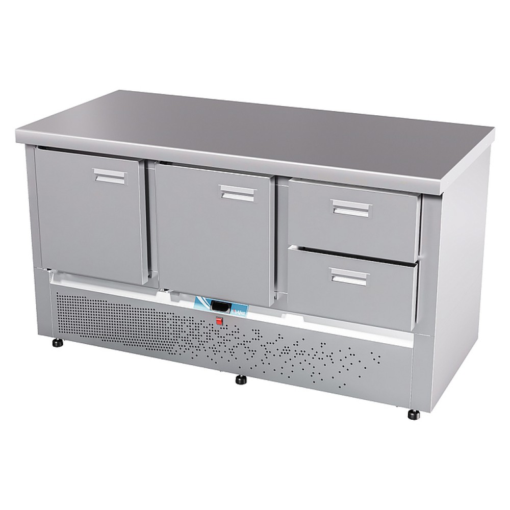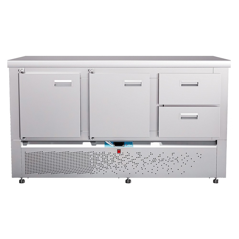 Холодильный стол Abat СХС-70Н-02 предназначен для раскатки теста, обработки ингредиентов для приготовления блюд, охлаждения и кратковременного хранения скоропортящихся продуктов и напитков на предприятиях общественного питания и торговли. Модель оснащена неохлаждаемой рабочей поверхностью, 2 распашными дверцами с доводчиками, 2 регулируемыми по высоте полками-решетками, 2 ящиками и регулируемыми по высоте ножками.