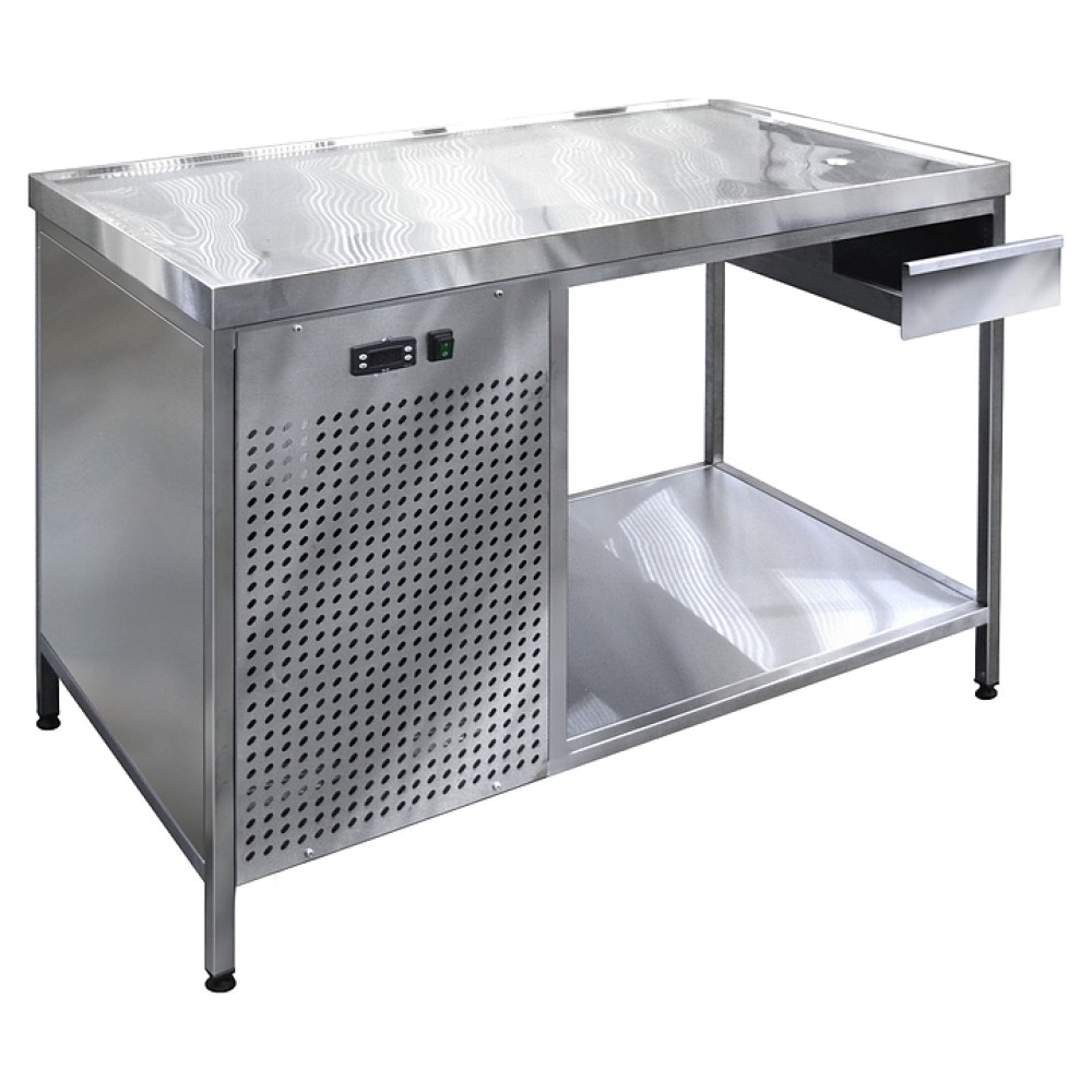 Холодильный стол Finist СХСо-1100-700 предназначен для разделки полуфабрикатов мяса и рыбы, а также для демонстрации и выкладки продуктов на предприятиях общественного питания и торговли. Модель оснащена расположенным сбоку агрегатным отсеком, столешницей с охлаждаемой поверхностью, открытой полкой для хранения инвентаря, выдвижным ящиком-лотком, устойчивыми ножками с подпятниками, кабелем питания с евровилкой и кнопочной панелью управления с цифровым дисплеем. Корпус выполнен из высококачественной нержавеющей стали.