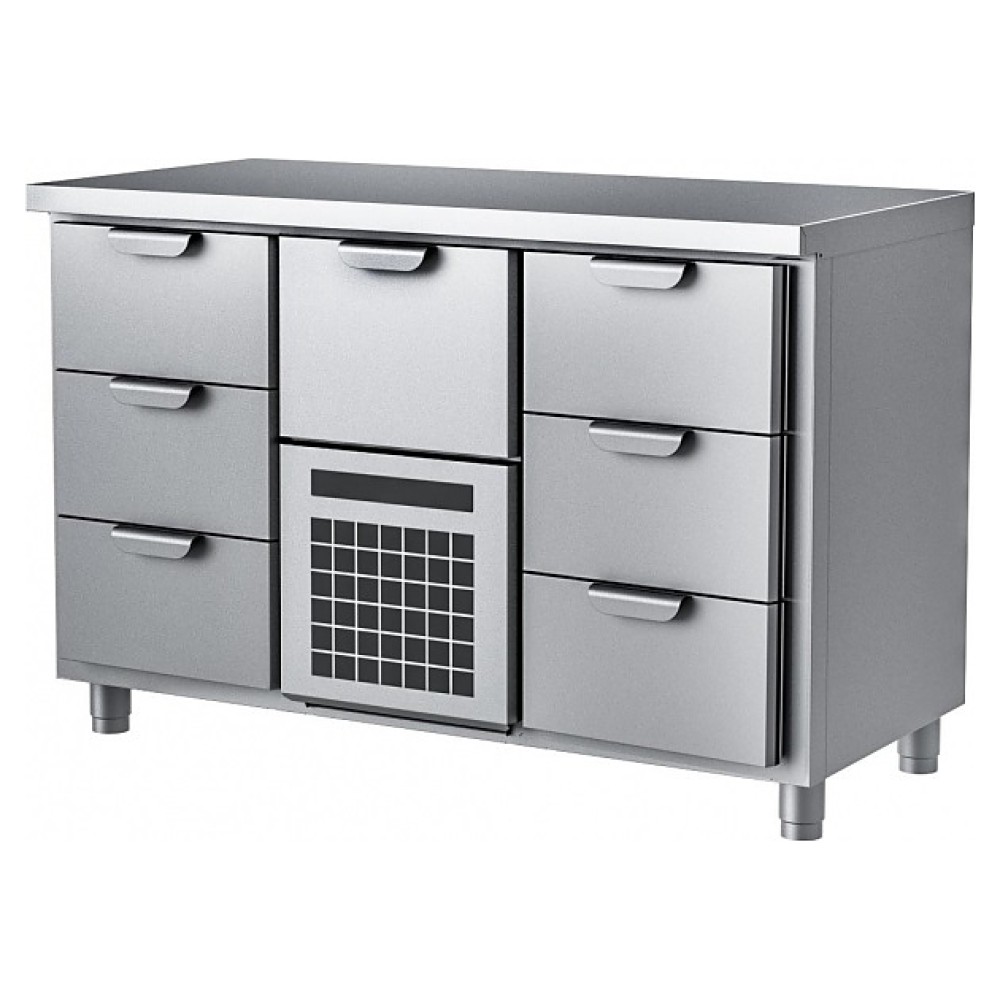 Холодильный стол HappyChef TC BD 3-CBR-3 предназначен для хранения предварительно охлажденных пищевых продуктов и напитков, а также обработки ингредиентов в процессе приготовления блюд на предприятиях общественного питания и торговли. Модель оснащена секцией с компрессорным холодильным агрегатом со съемной холодильной кассетой (Россия) с нижним центральным расположением и верхним выдвижным ящиком, секцией слева и секцией справа с 3 выдвижными ящиками в каждой, усиленной столешницей без борта и электронной панелью управления, ящики имеют короткие горизонтальные рукоятки в верхней части. Корпус выполнен из нержавеющей стали марки AISI 430, столешница – из нержавеющей стали марки AISI 304.