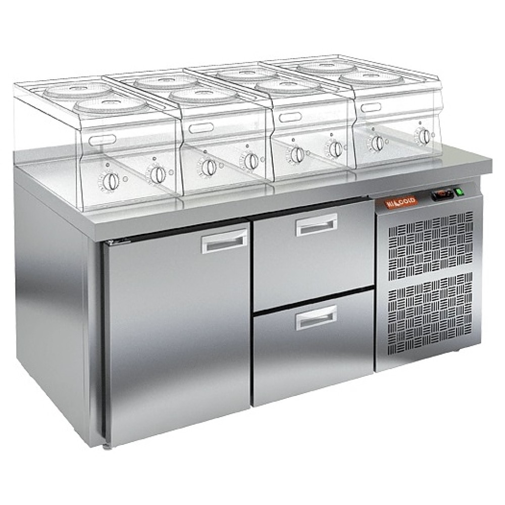 Холодильный стол HICOLD GN 12 BR2 TN LT предназначен для хранения предварительно охлажденных пищевых продуктов, обработки ингредиентов в процессе приготовления блюд, а также размещения теплового оборудования на предприятиях общественного питания и торговли. Модель оснащена встроенным компрессорным холодильным агрегатом с боковым расположением, электронной панелью управления, столешницей c бортом, холодильной камерой с 2 секциями: 1 с распашной дверью и 1 с 2 выдвижными ящиками. Корпус и столешница выполнены из нержавеющей стали.