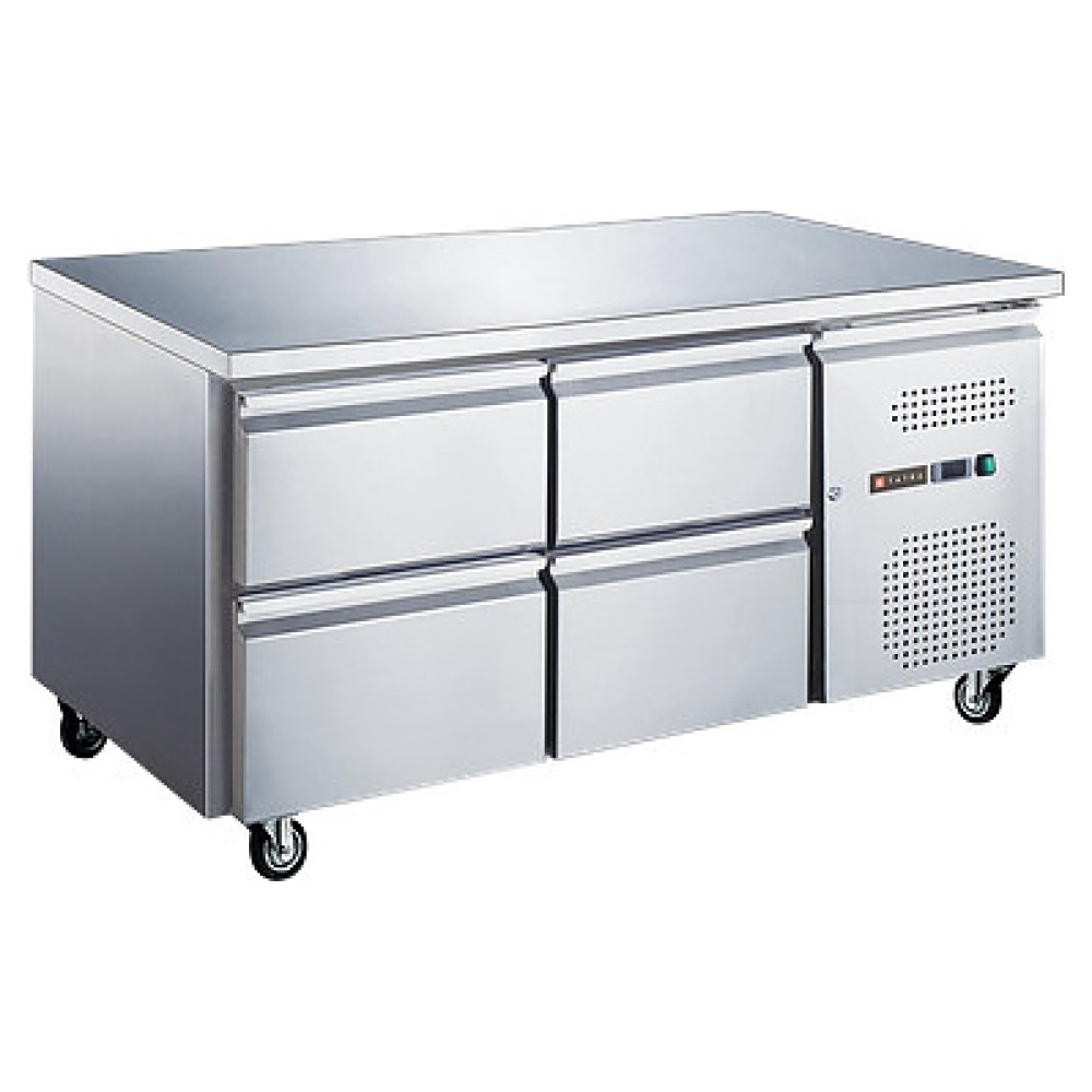 Холодильный стол Tatra TRTGND4 TN предназначен для хранения предварительно охлажденных мясных и рыбных полуфабрикатов, заготовок для салатов, молочной продукции, напитков, а также раскатки теста и обработки пищевых продуктов на предприятиях общественного питания и торговли. Модель оснащена встроенным компрессорным холодильным агрегатом с боковым расположением, электронным контроллером с цифровым дисплеем индикации на фронтальной панели, столешницей, холодильной камерой с 2 секциями, каждая секция оснащена 2 выдвижными ящиками. Корпус выполнен из высококачественной нержавеющей стали.