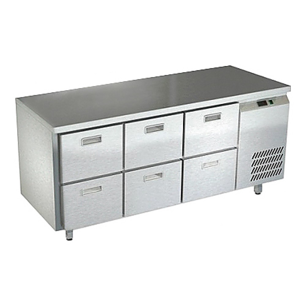 Холодильный стол Техно-ТТ СПБ/О-123/06-1307 предназначен для раскатки теста, обработки, охлаждения и кратковременного хранения продуктов и напитков на предприятиях общественного питания и торговли. Модель оснащена 3 секциями с 6 ящиками, направляющими с доводчиками (Австрия) и круглыми ножками, регулируемыми по высоте на 50 мм (Италия). Корпус выполнен из нержавеющей стали AISI 430, задняя стенка и дно - из оцинкованной стали.