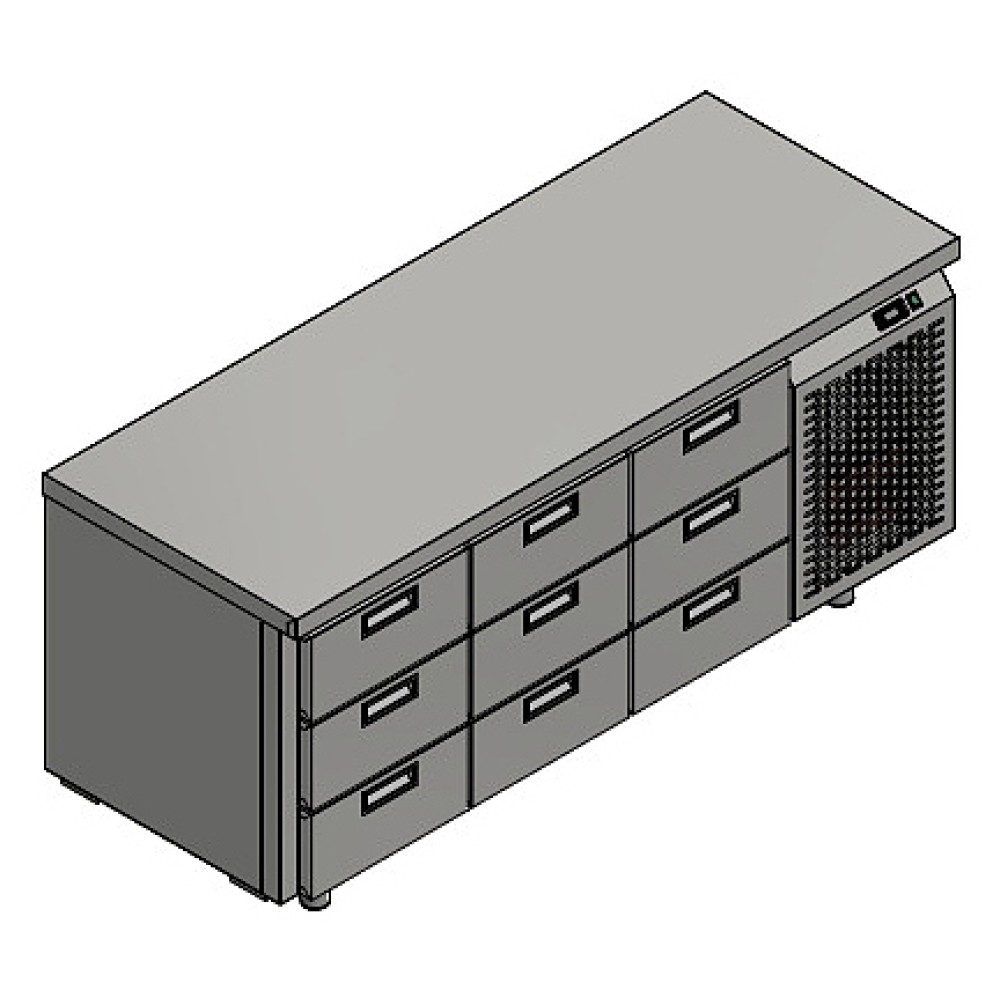 Холодильный стол Техно-ТТ СПБ/О-123/089-1807 предназначен для раскатки теста, обработки, охлаждения и кратковременного хранения продуктов и напитков на предприятиях общественного питания и торговли. Модель оснащена 3 секциями с 9 ящиками, направляющими с доводчиками (Австрия) и круглыми ножками, регулируемыми по высоте на 50 мм. Корпус выполнен из нержавеющей стали AISI 430, задняя стенка и дно - из оцинкованной стали.