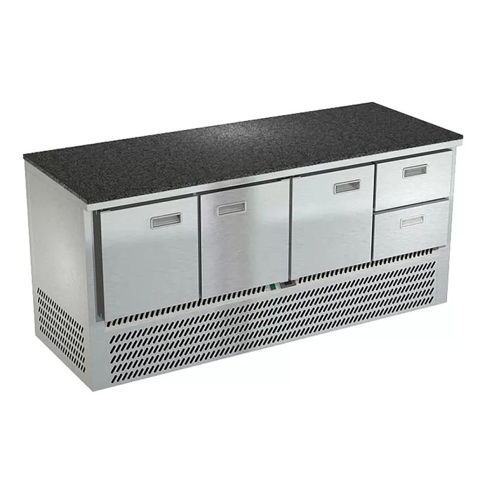 Холодильный стол Техно-ТТ СПН/О-322/32-1907 предназначен для обработки, охлаждения и кратковременного хранения продуктов и напитков на предприятиях общественного питания и торговли. Модель оснащена компрессором (Испания), секция - направляющими и сетчатой полкой, дверь и ящики - доводчиками. Корпус выполнен из нержавеющей стали, задняя стенка и дно - из оцинкованной стали. Столешница из камня.