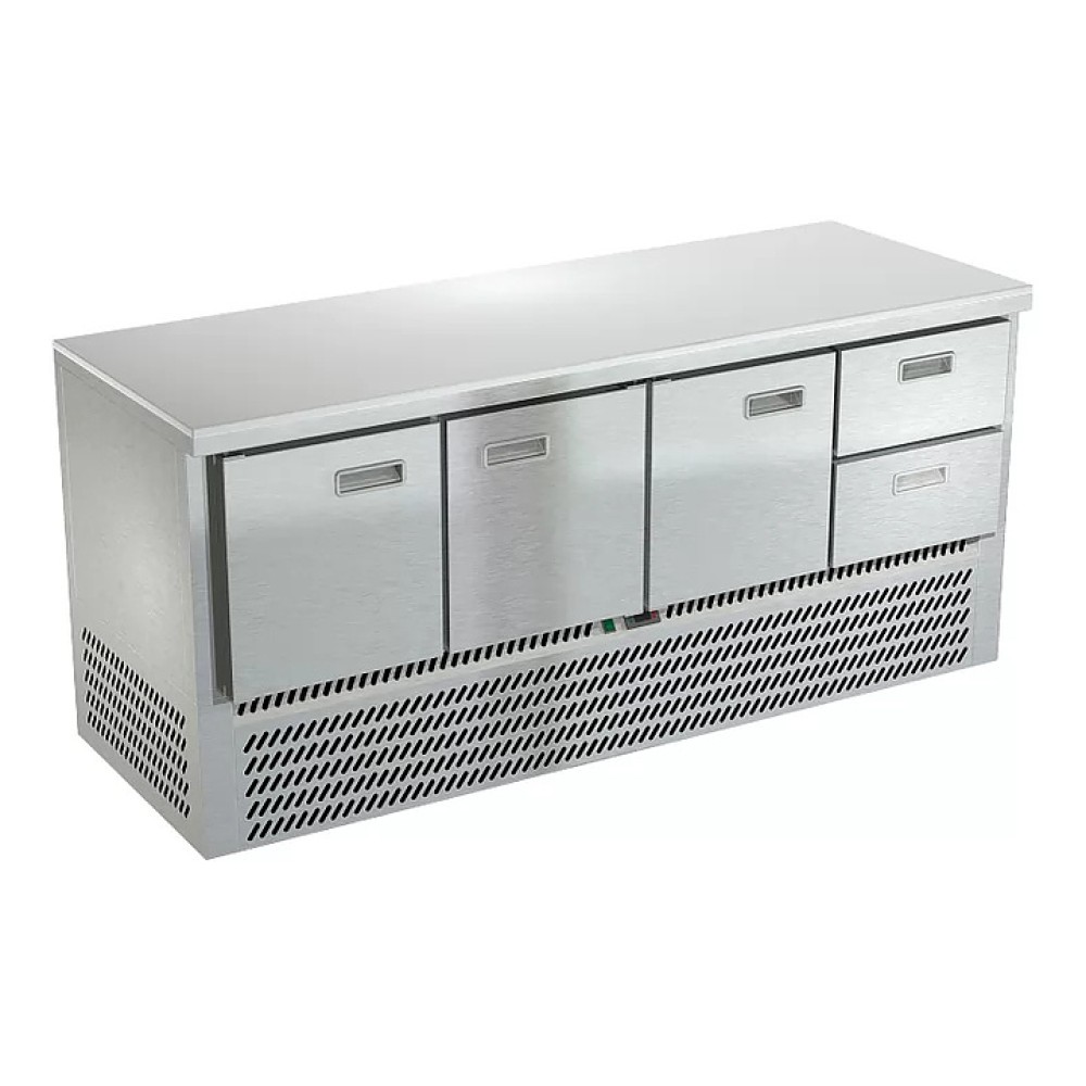 Холодильный стол Техно-ТТ СПН/О-522/32-1906 предназначен для обработки, охлаждения и кратковременного хранения продуктов и напитков на предприятиях общественного питания и торговли. Модель оснащена компрессором (Испания), каждая секция - направляющими и сетчатой полкой, двери и ящики - доводчиками. Корпус выполнен из нержавеющей стали марки AISI 430, столешница из полипропилена, задняя стенка и дно - из оцинкованной стали.