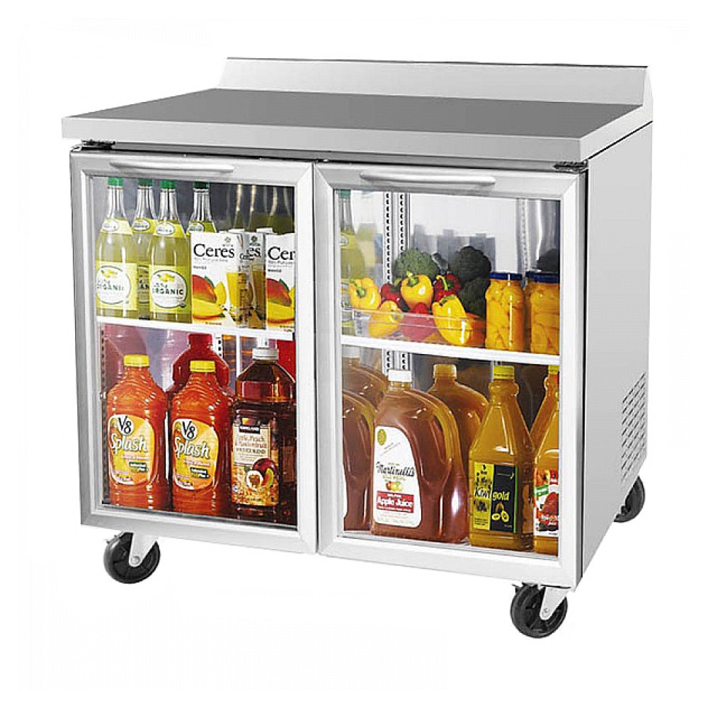 Холодильный стол Turbo air CMWR-36G предназначен для хранения и обработки предварительно охлажденных мясных и рыбных полуфабрикатов, заготовок для салатов, молочной продукции, охлажденных напитков и других пищевых продуктов на предприятиях общественного питания и торговли. Модель оснащена 2 дверцами с двойными стеклопакетами и слоем прозрачной теплоизоляционной пленки, 2 регулируемыми полками, и 4 колесами. Корпус выполнен из нержавеющей стали (гальванизированная сталь на оборотной стороне и внизу), пол - из нержавеющей стали с алюминиевыми вставками по бокам и сзади, полка - из толстой стальной проволоки с виниловым покрытием, дверные петли -из высококачественной нержавеющей стали, уплотнение - из ABS-пластика.