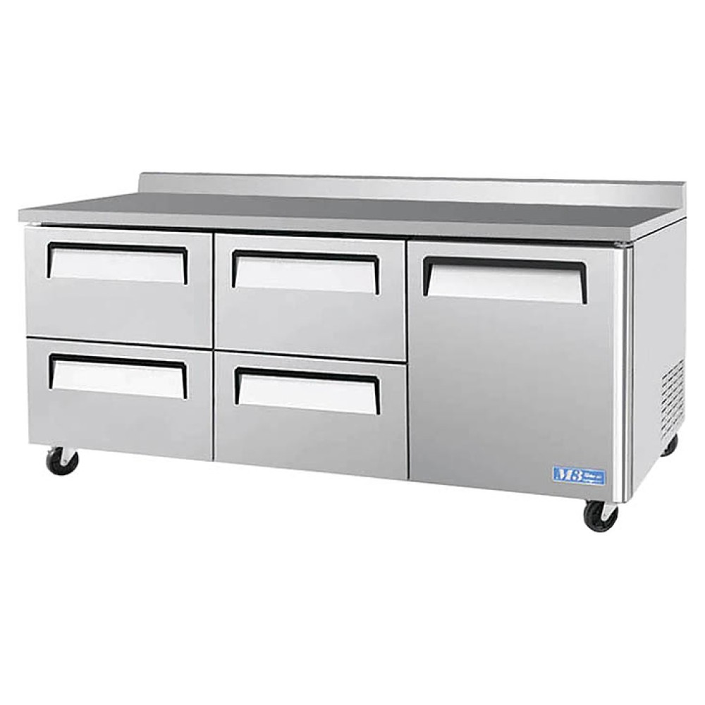 Холодильный стол Turbo air CMWR-72-2D-4 предназначен для раскатки теста, обработки, охлаждения и кратковременного хранения продуктов и напитков на предприятиях общественного питания и торговли. Корпус выполнен из нержавеющей стали (гальванизированная сталь на оборотной стороне и внизу) с применением пожаробезопасных стенок толщиной 60 мм, уплотнения - из АБС-пластика, пол - из нержавеющей стали с алюминиевыми вставками по бокам и сзади оборудования, регулируемые полки - из толстой стальной проволоки с виниловым покрытием, тройные направляющие - из высококачественной нержавеющей стали.