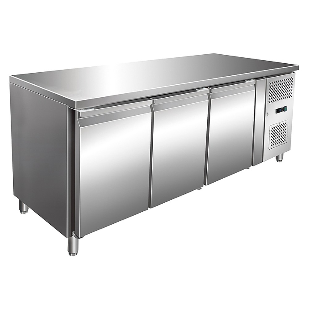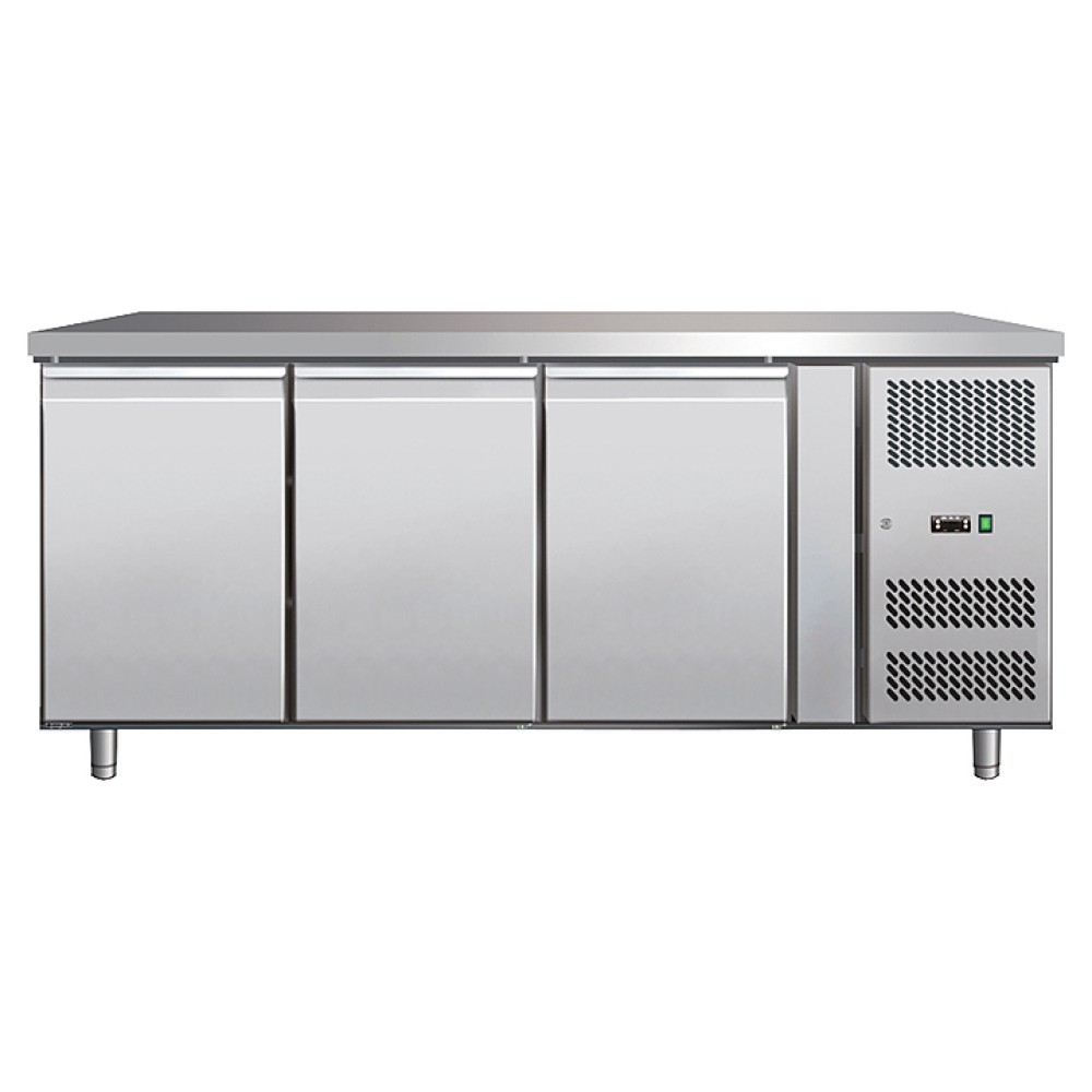 Холодильный стол VIATTO GN3100TN предназначен для обработки, охлаждения и кратковременного хранения пищевых продуктов на предприятиях общественного питания и торговли. Модель оснащена расположенным сбоку агрегатным отсеком, электронным термостатом, столешницей, 3 холодильными камерами с распашными дверьми, 3 полками для гастроемкостей, устойчивыми опорами, кабелем питания и панелью управления с цифровым дисплеем. Корпус и столешница выполнены из высококачественной нержавеющей стали.