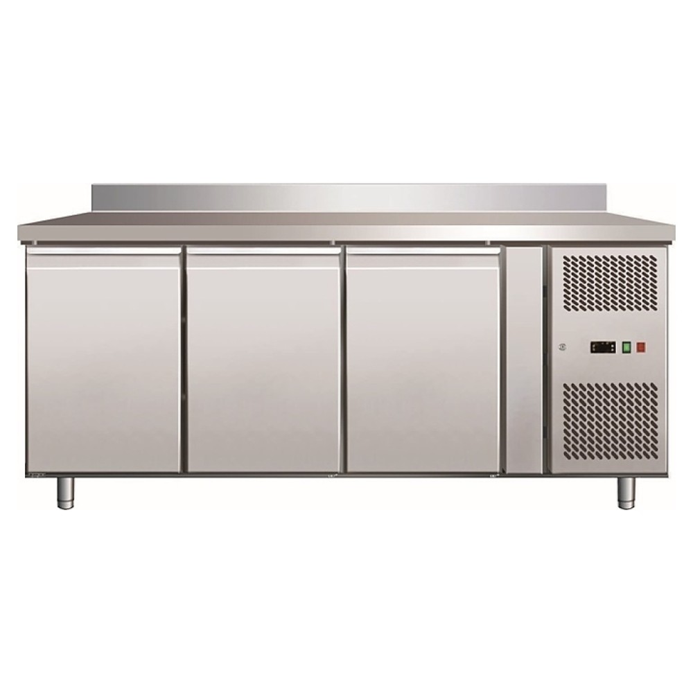 Холодильный стол VIATTO GN3200TN предназначен для обработки, охлаждения и кратковременного хранения пищевых продуктов на предприятиях общественного питания и торговли. Модель оснащена расположенным сбоку агрегатным отсеком, электронным термостатом, столешницей, 3 холодильными камерами с распашными дверьми, 3 полками для гастроемкостей, устойчивыми опорами, кабелем питания и панелью управления с цифровым дисплеем. Корпус и столешница выполнены из высококачественной нержавеющей стали.