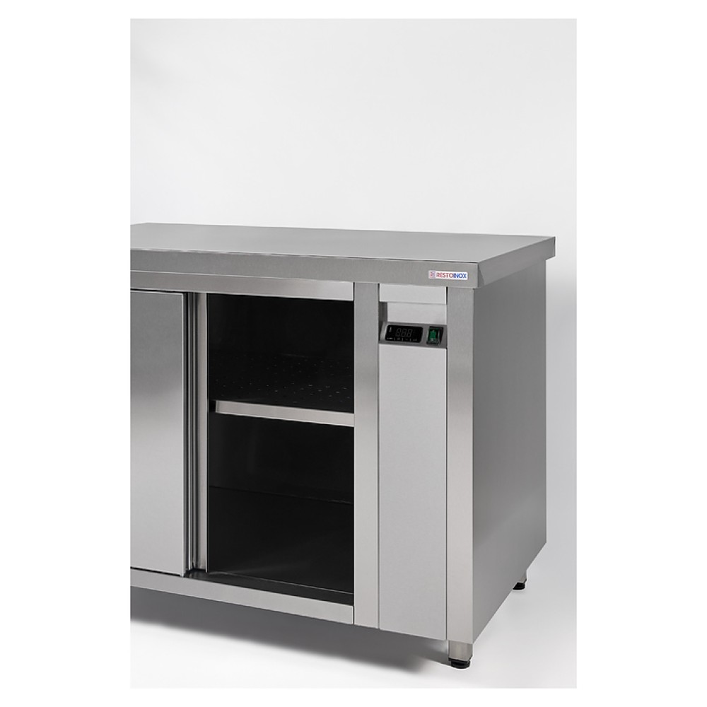 Тепловой стол Restoinox Т-СПСЗК-14/6 используется для подогрева и хранения в подогретом виде посуды, готовых блюд и напитков перед подачей, а также в качестве рабочей поверхности для приготовления на предприятиях общественного питания и торговли. Модель оснащена расположенным сбоку нагревательным отсеком с панелью управления, обогреваемой столешницей и сквозной камерой с дверьми-купе с двух сторон. Корпус, столешница и полка выполнены из высококачественной шлифованной нержавеющей стали AISI 430, опоры – из квадратного профиля стальной трубы AISI 430.