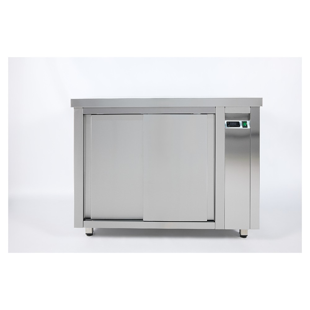Тепловой стол Restoinox Т-СПЗК-11/7 используется для подогрева и хранения в подогретом виде посуды, готовых блюд и напитков перед подачей, а также в качестве рабочей поверхности для приготовления на предприятиях общественного питания и торговли. Модель оснащена расположенным сбоку нагревательным отсеком с панелью управления, обогреваемыми столешницей и камерой с дверьми-купе. Корпус, столешница и полка выполнены из высококачественной шлифованной нержавеющей стали AISI 430, опоры – из квадратного профиля стальной трубы AISI 430.