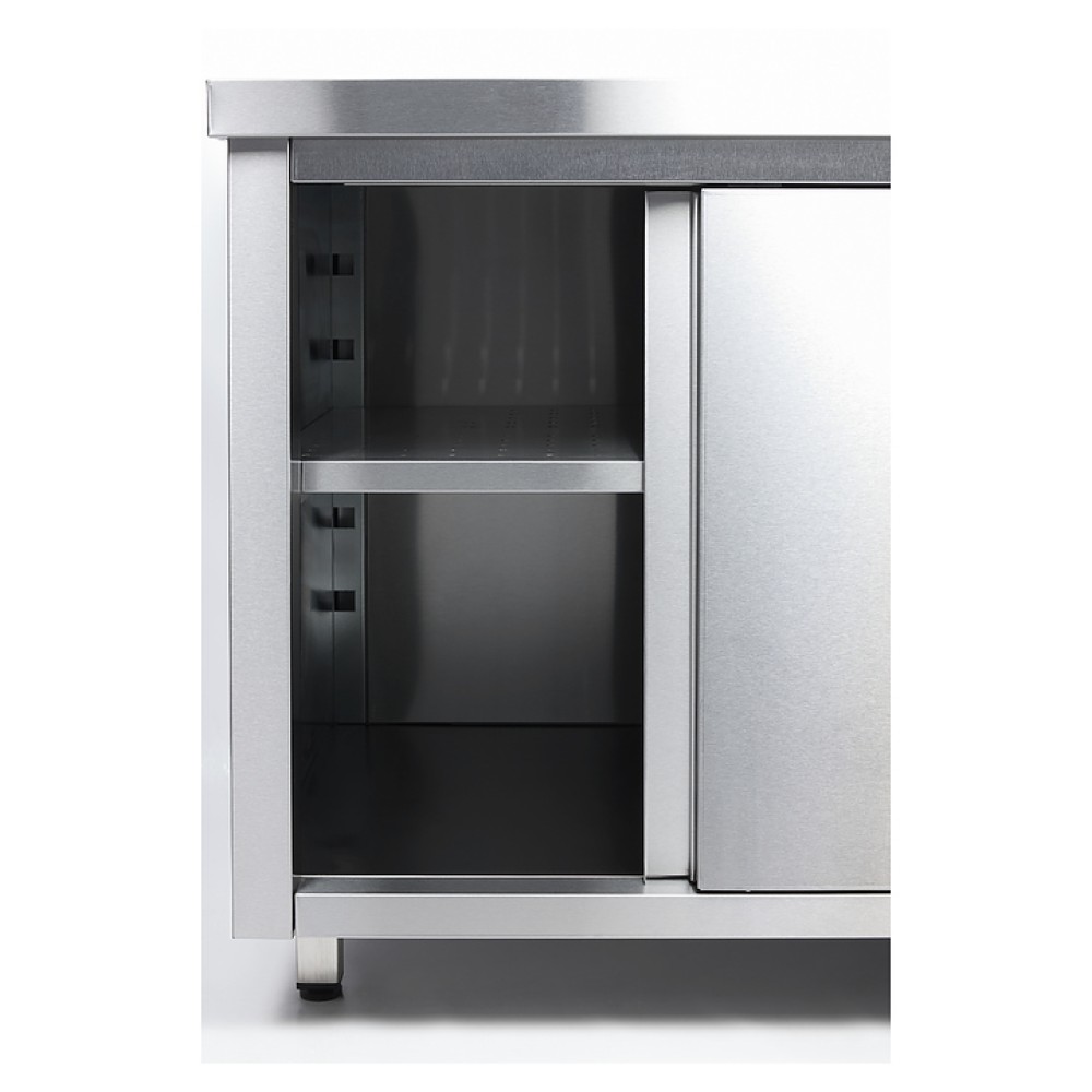 Тепловой стол Restoinox Т-СПЗК-12/6 используется для подогрева и хранения в подогретом виде посуды, готовых блюд и напитков перед подачей, а также в качестве рабочей поверхности для приготовления на предприятиях общественного питания и торговли. Модель оснащена расположенным сбоку нагревательным отсеком с панелью управления, обогреваемыми столешницей и камерой с дверьми-купе. Корпус, столешница и полка выполнены из высококачественной шлифованной нержавеющей стали AISI 430, опоры – из квадратного профиля стальной трубы AISI 430.