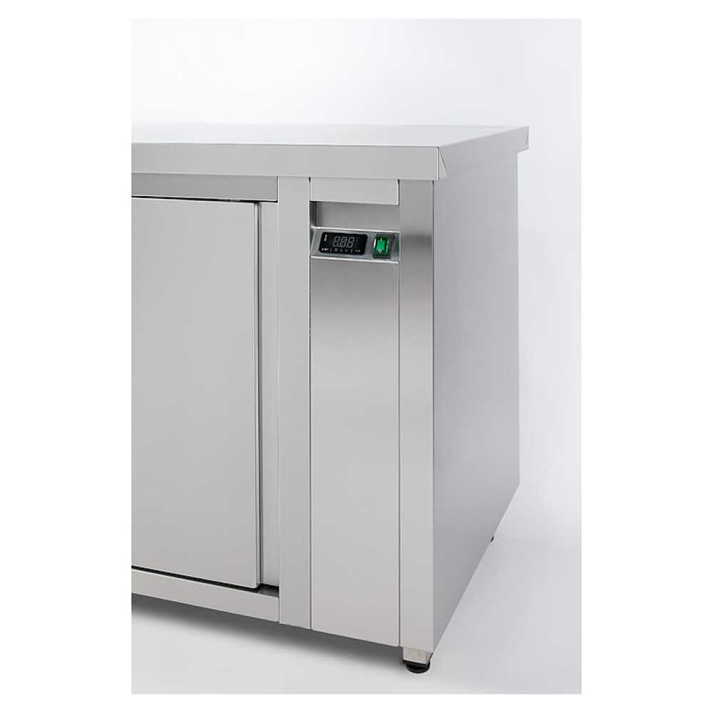Тепловой стол Restoinox Т-СПЗК-13/6 используется для подогрева и хранения в подогретом виде посуды, готовых блюд и напитков перед подачей, а также в качестве рабочей поверхности для приготовления на предприятиях общественного питания и торговли. Модель оснащена расположенным сбоку нагревательным отсеком с панелью управления, обогреваемыми столешницей и камерой с дверьми-купе. Корпус, столешница и полка выполнены из высококачественной шлифованной нержавеющей стали AISI 430, опоры – из квадратного профиля стальной трубы AISI 430.