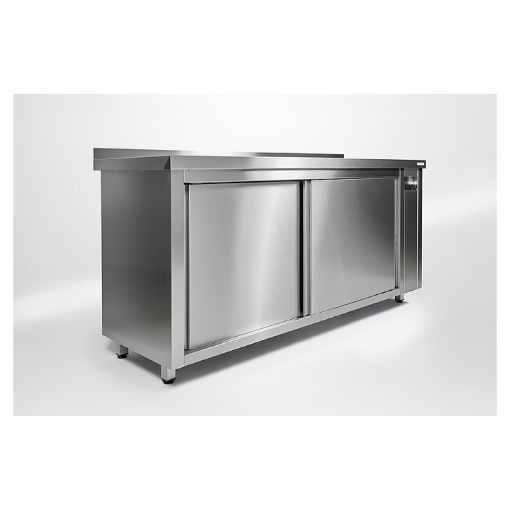 Тепловой стол Restoinox Т-СПЗК-16/7-Б используется для подогрева и хранения в подогретом виде посуды, готовых блюд и напитков перед подачей, а также в качестве рабочей поверхности для приготовления на предприятиях общественного питания и торговли. Модель оснащена расположенным сбоку нагревательным отсеком с панелью управления, обогреваемыми столешницей с задним бортом и камерой с дверьми-купе. Корпус, столешница и полка выполнены из высококачественной шлифованной нержавеющей стали AISI 430, опоры – из квадратного профиля стальной трубы AISI 430.