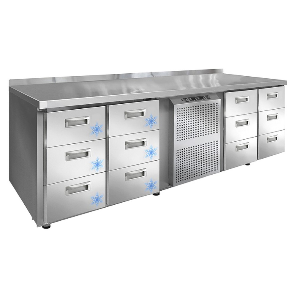 Холодильно-морозильный стол Finist КХС-700-3-3/3-3 предназначен для хранения замороженных полуфабрикатов и предварительно охлажденных готовых блюд, заготовок для салатов, молочной продукции и напитков на предприятиях общественного питания и торговли. Модель сочетает в себе 2 независимых рабочих объема и оснащена 2 панелями управления для регулировки температуры в камерах. Оборудование полностью выполнено из высококачественной пищевой нержавеющей стали.
