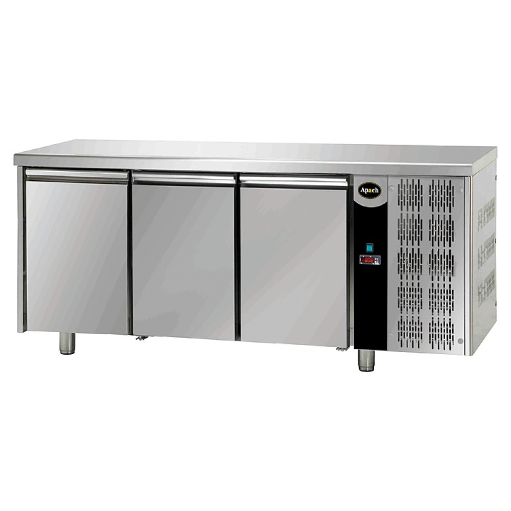 Морозильный стол Apach AFM 03BT предназначен для раскатки теста, обработки, заморозки и долговременного хранения продуктов, полуфабрикатов, напитков и мороженого на предприятиях общественного питания и торговли. Модель с электронной панелью управления оснащена самозакрывающимися дверями с магнитным уплотнителем. Корпус и внутренняя камера изготовлены из нержавеющей стали AISI 306, изоляция - из пенополиуретана толщиной 60 мм.